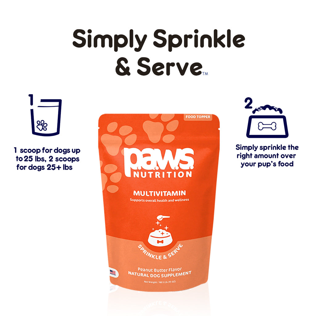 1 scoop for dogs up to 25 lbs and 2 scoops for dogs more than 25 pounds during each meal. Simply sprinkle and serve.