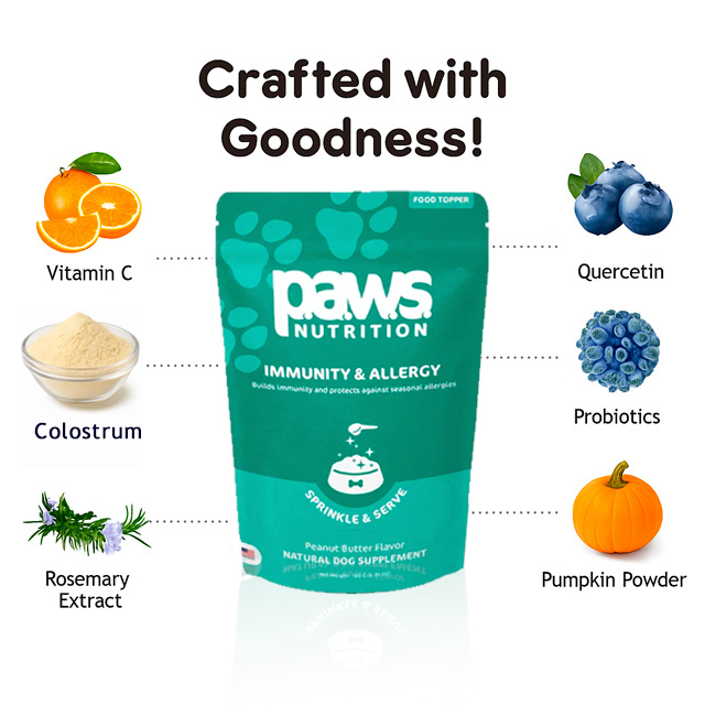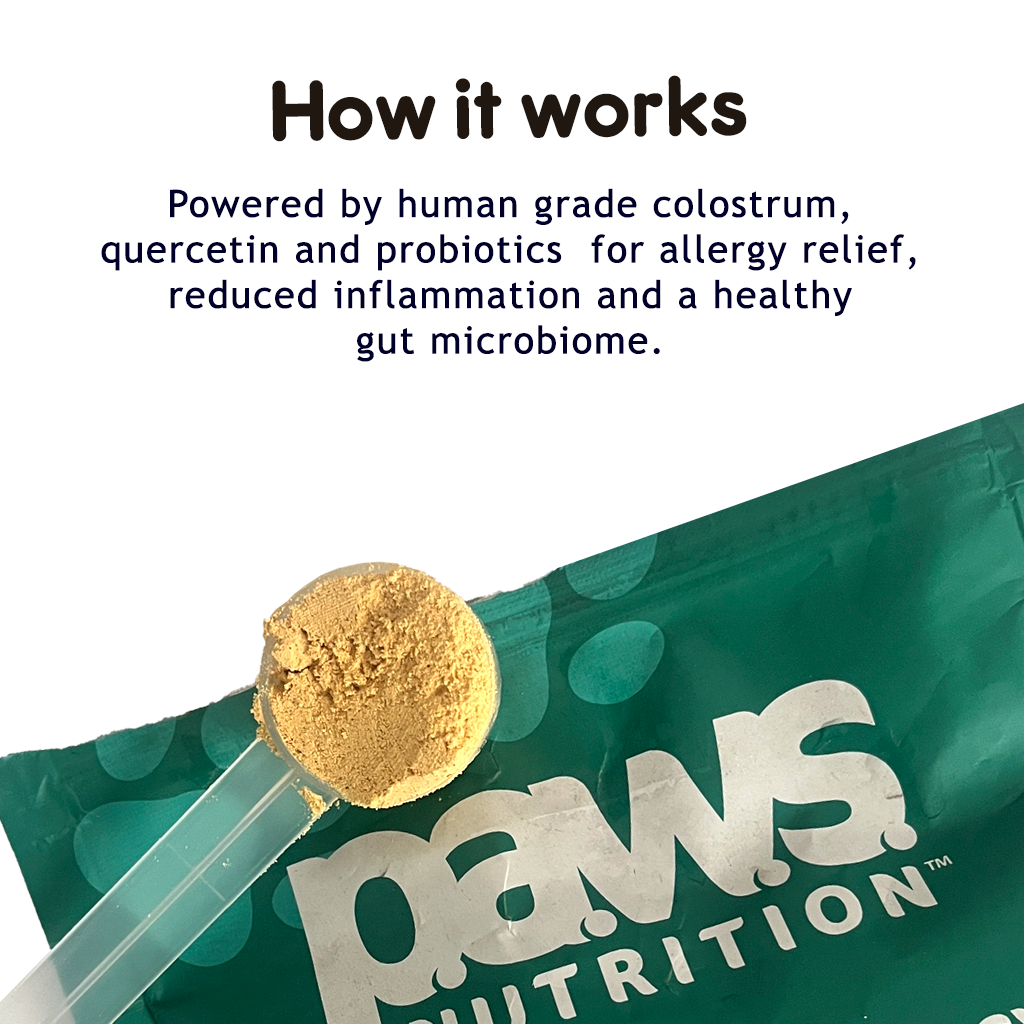 Say goodbye to itching and scratching. Our allergy relief blend, powered by colostrum and quercetin soothes irritation while our proprietary probiotic and vitamin blend strengthens immunity. Soothing pumpkin provides additional digestive support for the most sensitive stomachs.