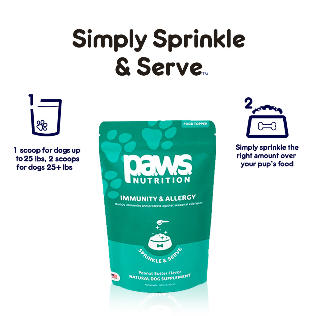 1 scoop for dogs up to 25 lbs and 2 scoops for dogs more than 25 pounds during each meal. Simply sprinkle and serve.